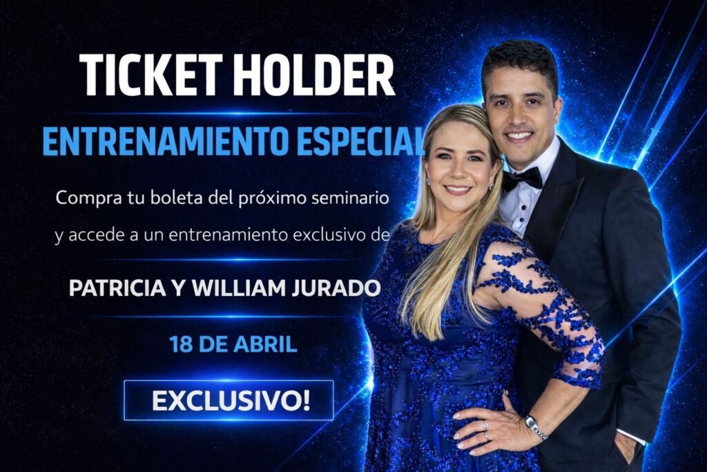 Tu entrada incluye acceso al Seminario de Abril, al Ticket Holder exclusivo con William y Patricia, y la oportunidad de llevar un invitado nuevo al seminario de mayo. ¡Únete y transforma tu futuro!
